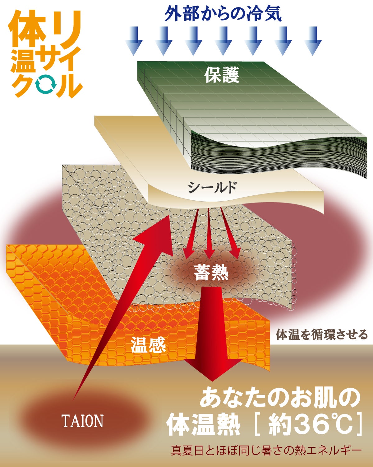 究極の熱エネルギーは体温、あなたのお肌の真夏の気温に近い体温熱[約36℃]を利用して体温を蓄えて再び放熱。それは「体温リサイクル」です。