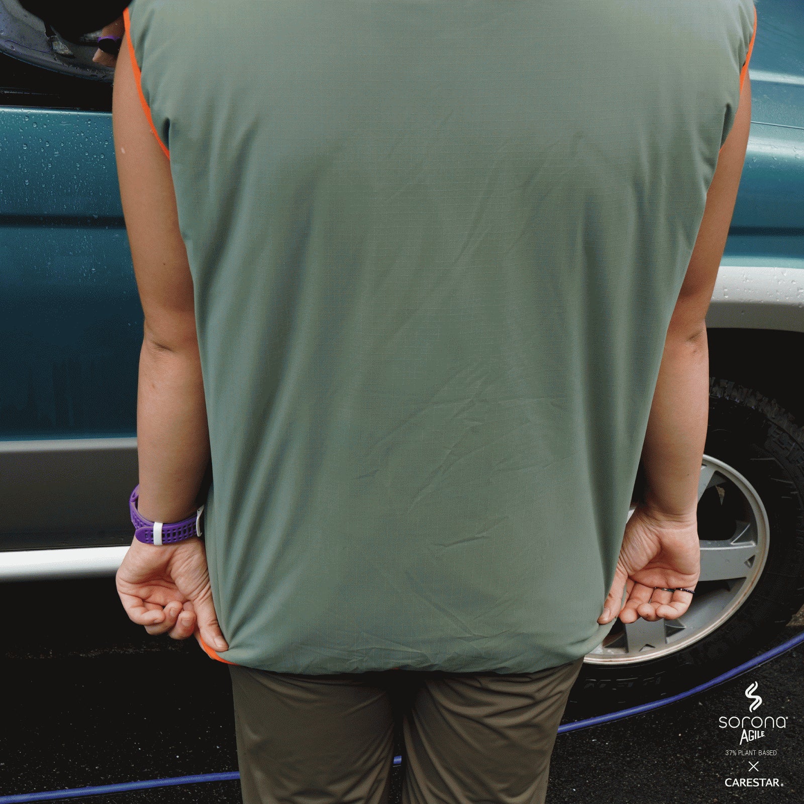 ●全天候型対応ベストジャケット。撥水加工で水を弾いてCARESTAR「体温リサイクル®」で暖まる